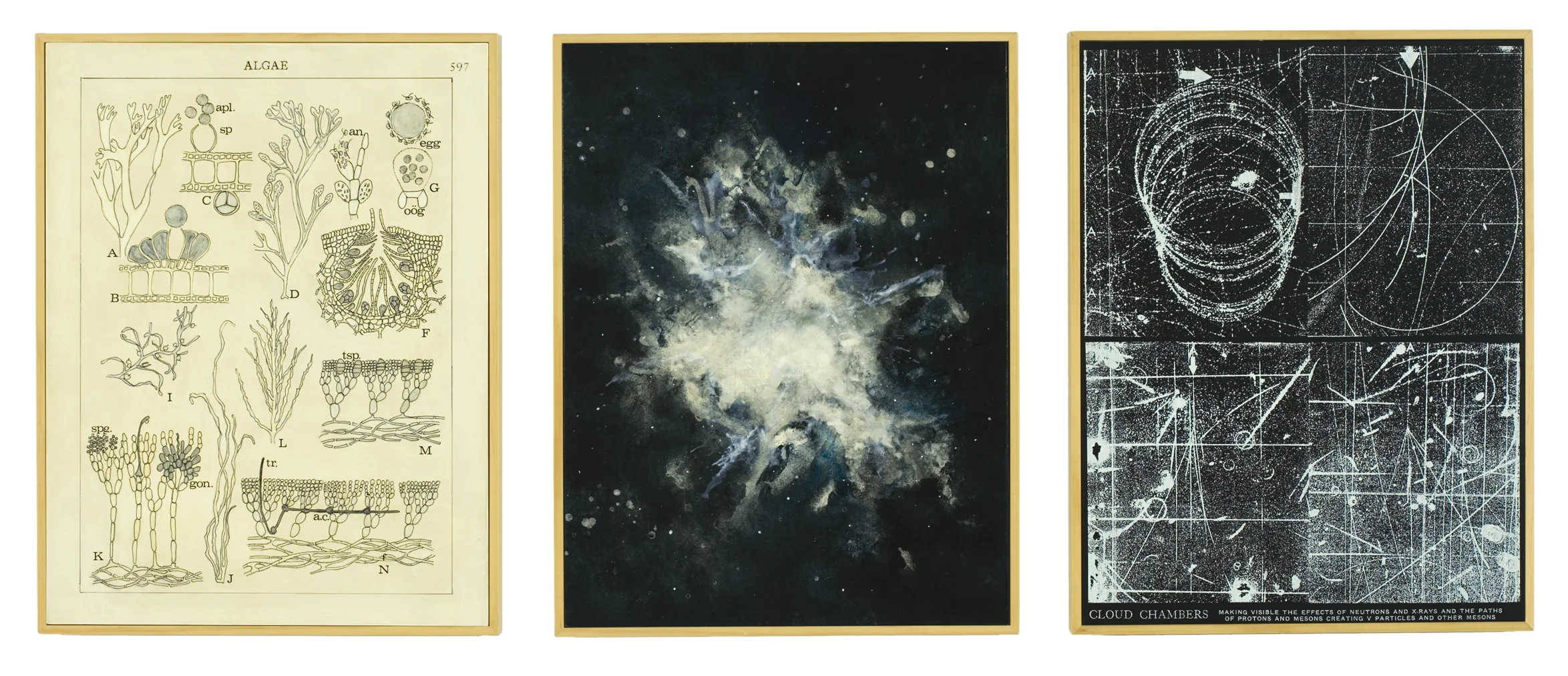 These paintings contain various images that attempt to describe or explain the cosmos and its origins. The images include photographs of the heavens as seen through a telescope, scientific diagrams and illustrations from spiritual texts, including Tantric paintings from India.